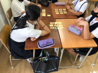 6年生の教室では、アルファベットカードを使って班でビンゴゲームをしていました。