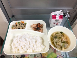 今日の献立は、さけのしょうゆ風味焼き、五目汁、高野どうふのいり煮、ごはん、牛乳です。
