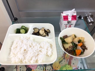 今日の献立は、肉じゃが、焼きなすのみぞれだれかけ、あっさりきゅうり、ごはん、牛乳です。