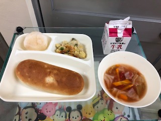 今日の献立は、豆乳マカロニグラタン(米粉)、トマトスープ、なし、おさつパン、牛乳です。