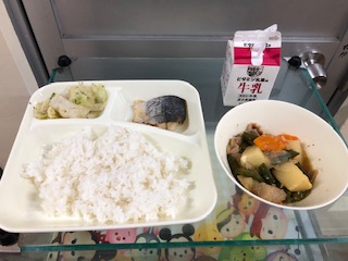 今日の献立は、さごしの塩焼き、豚肉とじゃがいもの煮もの、キャベツの梅風味、ごはん、牛乳です。