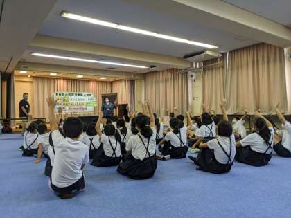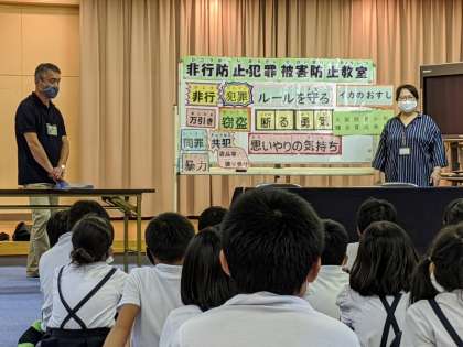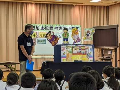 万引きについては、ペープサート(紙人形劇)でわかりやすく教えてもらいました。他にも、声掛け被害やいじめについて、おごったりおごられたりしないこと、自分の意思を大事にすること、周りの人に相談することなど、大事なことをたくさん話してくださいました。