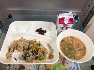 今日の献立は、他人丼、とうがんのみそ汁、金時豆の煮もの、牛乳です。