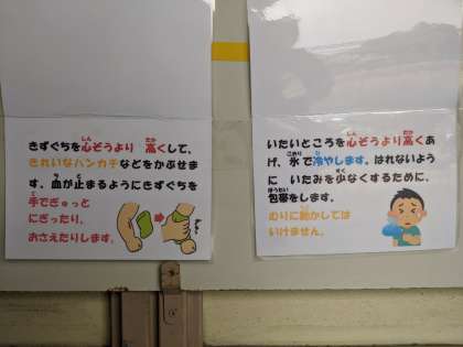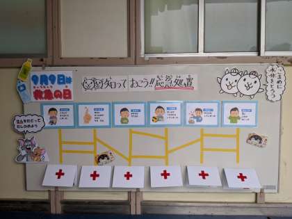 今日は9月9日「救急の日」ということで、保健室前に応急処置について掲示しています。