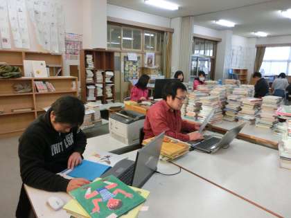 集団下校で子どもたちが下校した後は、職員総がかりで、図書館の本のバーコード管理化を図る作業に取りかかりました。およそ2時間近く作業に没頭。子どもたちの図書館の利用にプラスになるようにと、地道な作業を続けています。