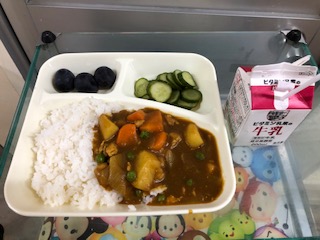 今日の献立は、チキンカレーライス(米粉)、きゅうりのピクルス、ぶどう(巨峰)、牛乳です。