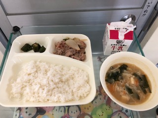 今日の献立は、豚肉の甘辛焼き、みそ汁、オクラのおかかいため、ごはん、牛乳です。