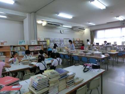 今日は、夏休みを利用しての「図書館の大整理」。古い本を整理し、より見やすく利用しやすい美しい図書館をめざして、職員による合同作業です。プール開放や勉強会に来ていた子どもたちも応援に来てくれました。「読書の好きな子」の育成に向けて、一生懸命の作業です。