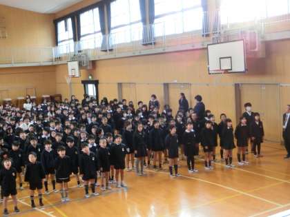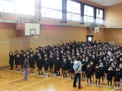 講堂での始業式では、まずは校歌斉唱で式が始まり、久しぶりに元気な子どもたちの歌声が、講堂全体に響き渡りました。その後の校長先生のお話では、一人ひとり目標をもって3学期に臨むように子どもたちへの投げかけがありました。3学期は3ヵ月足らず、最も短い学期ですが、目標を持って活動する子どもたちの輝きにたくさん出会いたいなあと思います。