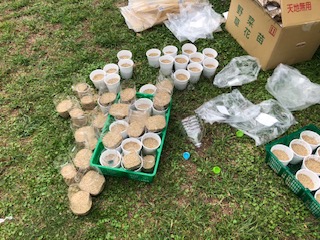 ペットボトルやプラカップに入ったたくさんの種を、みんなでまいていきます。風で飛ばないよう、同じところにばかりまかないよう、気をつけながら、なるべく地面に近いところにまいていきます。