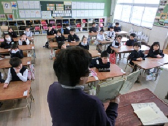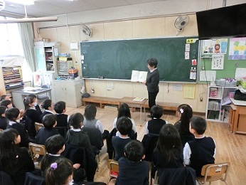大正図書館の企画により、「学校おはなし会」を1年生で開きました。「ひまわりの会」の方に来ていただき、1年生の各クラスで読み聞かせをしていただきました。1年生は、静かに集中して読み聞かせに聴き入り、絵本の世界に引き込まれていました。