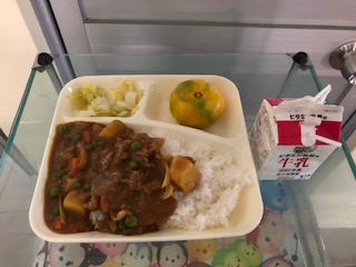 今日の献立はポークカレーライス(米粉)、はくさいのピクルス、みかん、牛乳です。