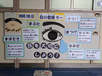 保健室前に、目を大切にするための掲示をしています。