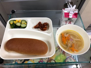 今日の献立は、まぐろのオーロラ煮、ベーコンとじゃがいものスープ、きゅうりとコーンのゆずドレッシング、こくとうパン、牛乳です。