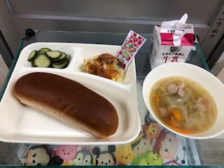 今日の献立は、ツナポテトオムレツ、スープ、きゅうりのバジル風味サラダ、こくとうパン、牛乳です。