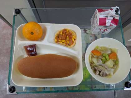 今日の献立は、豚肉と野菜のスープ煮、変わりピザ、みかん、いちごジャム、パン、牛乳です。
