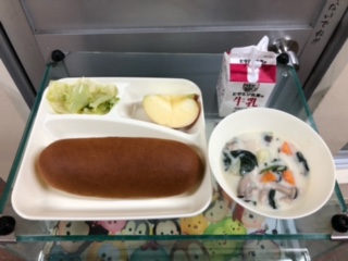 今日の献立は、きのこのクリームシチュー、キャベツのピクルス、りんご、こくとうパン、牛乳です