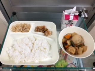 今日の献立は、あげどりのねぎだれかけ、含め煮、もやしのピリ辛あえ、ごはん、牛乳です。