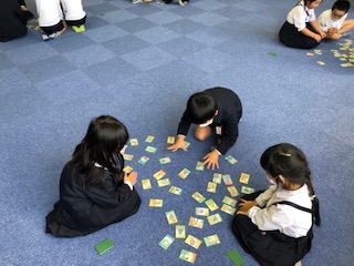 懐かしい昔遊びのひとつ、「いろはがるた」で1年生が遊んでいました。