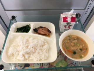 今日の献立は、なまりぶしのしょうが煮、みそ汁、ほうれんそうのおひたし、ごはん、牛乳です。