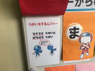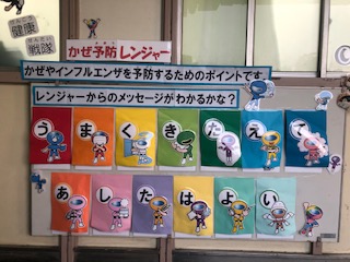 保健室の掲示板に「かぜ予防レンジャー」が現れました。