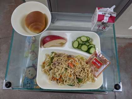 今日の献立は、和風焼きそば、きゅうりの甘酢あえ、1/2こくとうパン、牛乳、りんごです。