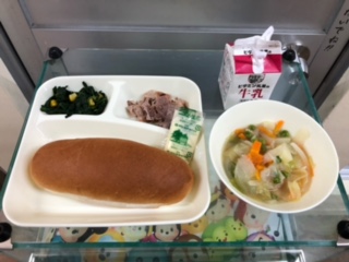 今日の献立は、豚肉のガーリック焼き、スープ、ほうれんそうのソテー、コッペパン、牛乳、ソフトマーガリンです。