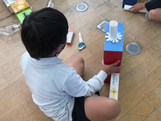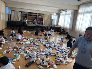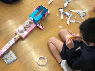 この1,2ヶ月、1年生が、お菓子やティッシュの箱、トイレットペーパーやラップの芯などを家からたくさん持ってきて集めていました。