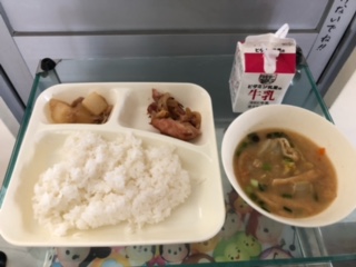 今日の献立は、鶏肉甘辛焼き、みそ汁、だいこんの煮もの、ごはん、牛乳です。