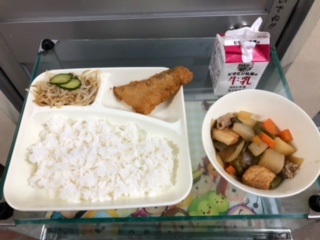 今日の献立は、たらのフライ、豚肉とあつあげの煮もの、もやしときゅうりのおひたし、ごはん、牛乳です。