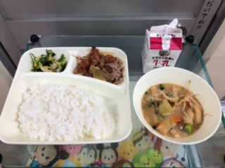 今日の献立は、豚肉のしょうが焼き、さつまいものみそ汁、きくなとはくさいのごまあえ、ごはん、牛乳です。
