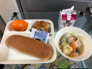 今日の献立は、鶏肉とじゃがいものスープ煮、きのこのドリア、みかん、コッペパン、ブルーベリージャム、牛乳です。