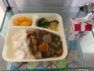 今日献立は、冬野菜のカレーライス、ブロッコリーとコーンのサラダ、桜桃(かんづめ)、牛乳です。