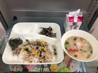今日は正月の行事献立です。 れんこんのちらしずし、ぞう煮、ごまめ、牛乳です