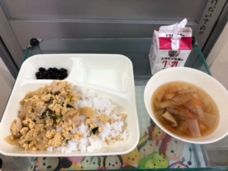今日の献立は、親子丼、すまし汁、黒豆の煮もの、牛乳です。