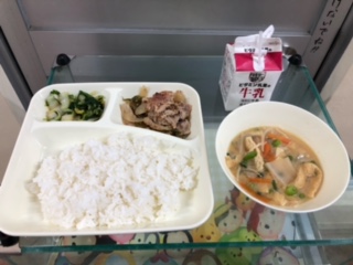今日の献立は、豚肉のごまだれ焼き、みそ汁、きくなとはくさいのおひたし、ごはん、牛乳です。