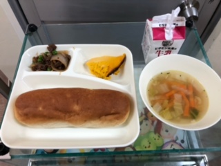 今日の献立は、牛肉のデミグラスソース煮、コーンとはくさいのスープ、かぼちゃのプリン、おさつパン、牛乳です。