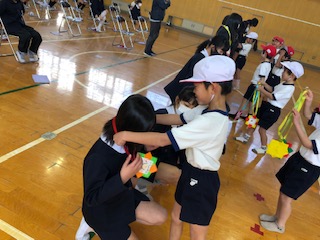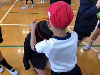 たてわり班でお世話になった6年生に「卒業おめでとう」と言ってメダルをかけていきます。背の高い6年生が、小さくかがんで、1年生がかけやすいようにしてくれている姿がとても微笑ましかったです。
