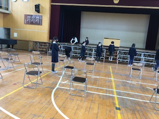 卒業を祝う会が無事に終わり、5年生が卒業式のためのいす並べをしました。