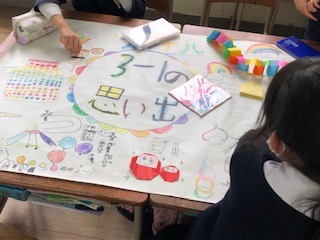 3年1組をのぞくと、班で一枚の大きな紙を囲んでいます。