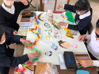 この1年間のクラスでの思い出や、班の友達との楽しかった出来事を絵で表したり、折り紙で作って貼ったり。