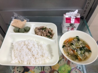 今日の献立は、豚肉と野菜のいためもの、すまし汁、きな粉よもぎだんご、ごはん、牛乳です。