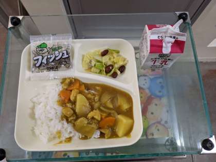 今日の献立は、チキンカレーライス、ビーンズサラダ、ミニフィッシュ、牛乳です。
