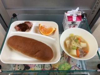 今日の献立は、鶏肉のみそバターソース、スープ煮、こくとうパン、牛乳、デコポンです。