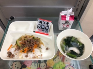 今日の献立は、ビビンバ、トック、いり黒豆、ごはん、牛乳です。