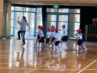 その後二列で歩いたり、スキップしたり、最後には鬼ごっこをしたりして、汗ばむほどしっかり運動ができて、大満足の一年生でした。