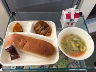 煮こみハンバーグ、コーンスープ、焼きかぼちゃ、コッペパン、いちごジャム、牛乳です。