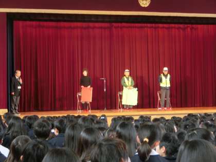 3月2日(月)、全校朝会の時間帯に、子ども見守り隊の方と図書館ボランティアの方、それぞれ代表の方にお越しいただきました。
