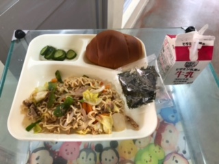 今日の献立は、焼きそば、きゅうりのしょうがづけ、1/2こくとうパン、牛乳です。