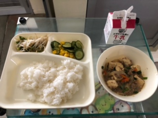 今日の献立は、マーボーどうふ、きゅうりとコーンの甘酢あえ、もやしとピーマンのごまいため、ごはん、牛乳です。